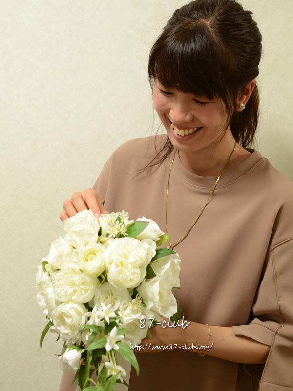 たっぷりのバラや芍薬を使ったキャスケードブーケです。