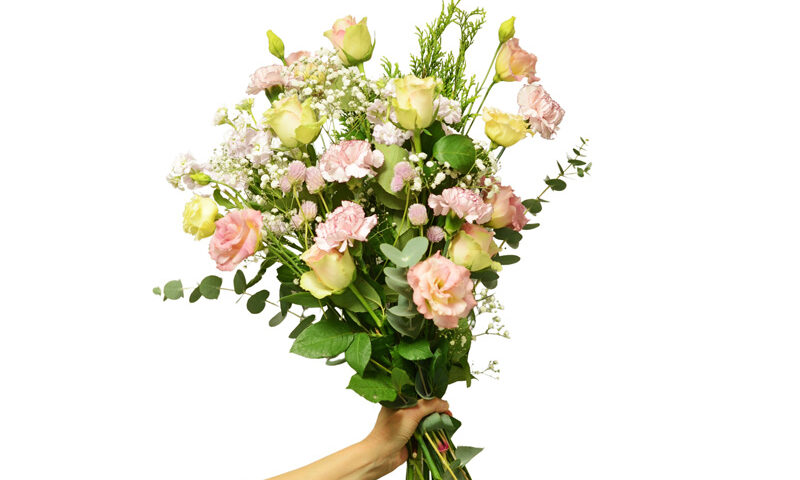 メイン花材のバラやトルコキキョウは目立つ位置に配置します。